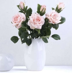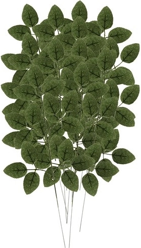 Kunstige rosenblade er et godt valg for dem, der ønsker en naturlig effekt uden vanding og nedfald. Hver kvist har tæt løv med markante bladårer og ser meget realistisk ud i buketter, kranse og alene i en vase.