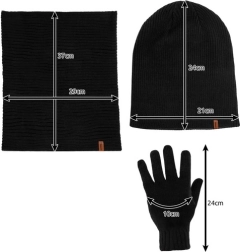 Komplet sættet inkluderer en sort hue, halstørklæde og handsker, alt lavet af akryl, ideelt til vinterperioden.