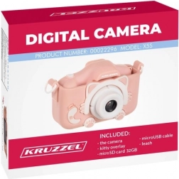 Det søde KRUZZEL børnekamera med 2'' skærm tager både fotos og videoer i Full HD, har en forreste selfie-linse, 5 indbyggede spil og masser af sjove rammer og filtre. Inkluderer 32GB kort, beskyttende silikonekatte-cover, håndledsrem og USB-kabel – det ideelle første kamera til små fotografer fra 3 år.