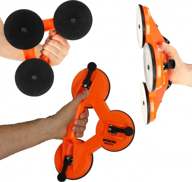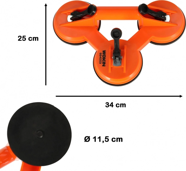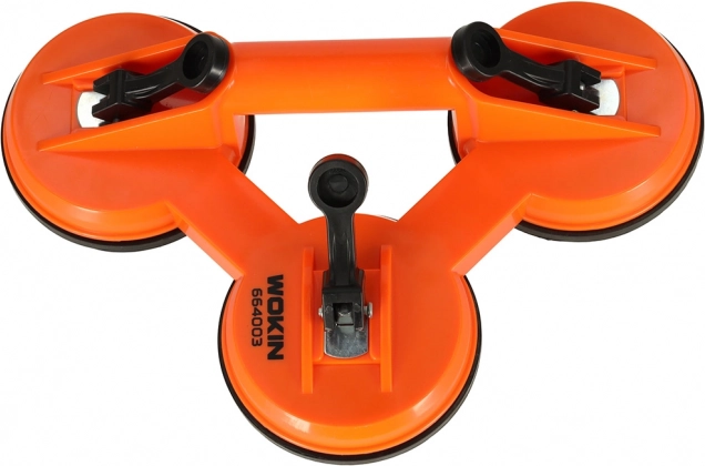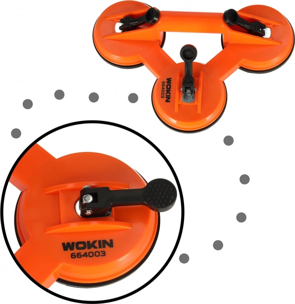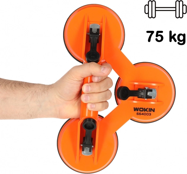 Professionel tredobbelt vakuumsugekop fra WOKIN med en bæreevne på 75 kg, som gør det nemt og sikkert at bære og positionere glas, glaserede overflader og storformatfliser. Tre sugepunkter med en diameter på 11,5 cm sikrer et stabilt greb uden at ridse overfladen, mens det ergonomiske håndtag giver præcis håndtering og højere arbejdskomfort.