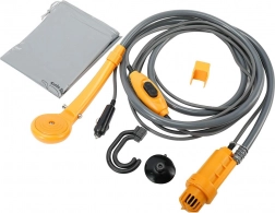 Sættet indeholder alt, hvad du behøver: nedsænket pumpe, brusehoved, slange, sugekop og krog til montering på vindue eller karrosseri. I samlet tilstand fylder den minimalt, hvilket du vil sætte pris på under rejser og camping.