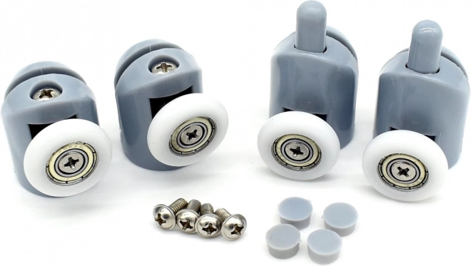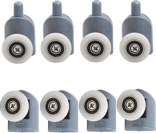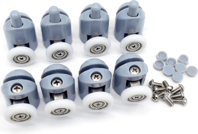 Sættet indeholder otte hjul, der muliggør en glat og problemfri bevægelse af brusedøre. Hvert hjul har en robust konstruktion af plast og stål.