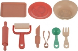 Sættet inkluderer en sikker kniv, gaffel, ske, skål, bakke og andre værktøjer, der understøtter kreative lege og hjælper børn med at udvikle deres fantasi.