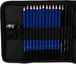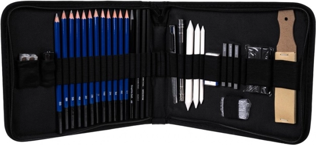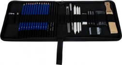 Der medfølger også blenders (papirtortillons) i tre diametre, en bogbinderkniv, dobbelt og klassisk blyantspidser, knædgummi (formbart viskelæder) samt et klassisk viskelæder og en sæt slibepapirer til perfekt formning af spidser. Sættet er fremragende til portræt, teknisk tegning og kunstneriske skitser.