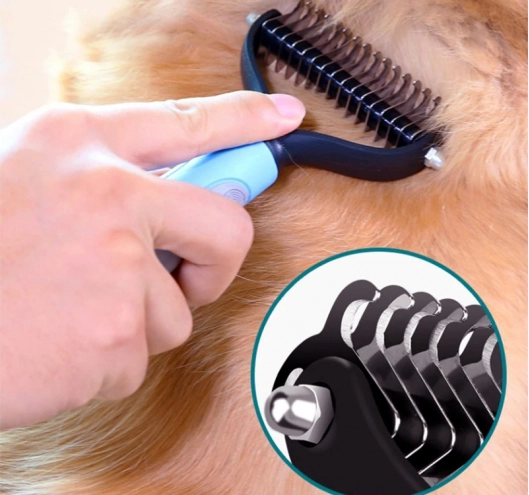 Lær vores trimmer til kæledyr at kende, som hurtigt og nemt fjerner uønsket pels fra din hund, kat eller hest. Den er udstyret med 17 rustfri stålblade, der er holdbare og robuste, hvilket sikrer værktøjets lange levetid.