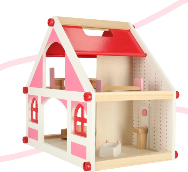 Det søde trædukkehus i lyserød-hvid udførelse giver timevis af kreativ leg. Det har to etager, åbne vinduer og døre og leveres med et komplet sæt møbler (badekar, sofa, lænestol, to stole, håndvask, seng og bord). Glat slebet træ sikrer sikker leg, og samlingen er nem takket være de medfølgende skruer og skruetrækker.