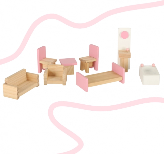 Pakken indeholder et rigt sæt trømøbler i blide lyserøde nuancer, så du straks kan indrette stue, badeværelse og soveværelse. Sjoven begynder allerede ved den fælles samling af huset – monteringen er enkel, og alle nødvendige dele følger med.