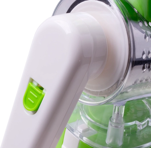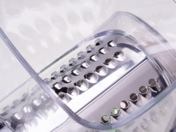 Hurtigt og effektivt manuelt roterende rivejern, som nemt og hurtigt river ost, grøntsager, frugt og nødder. Det er udstyret med en bred åbning, der kan rive eller skære store mængder mad på få sekunder, samt en trykstempel, der holder dine fingre væk fra knivene. Det tilbyder nem montering af udskiftelige blade. Den skrå påfylder reducerer eventuelle tilstopninger. Har en base med sugekop, som sikkert fastgør påfylderen til en ren, tør og ikke-porøs overflade.