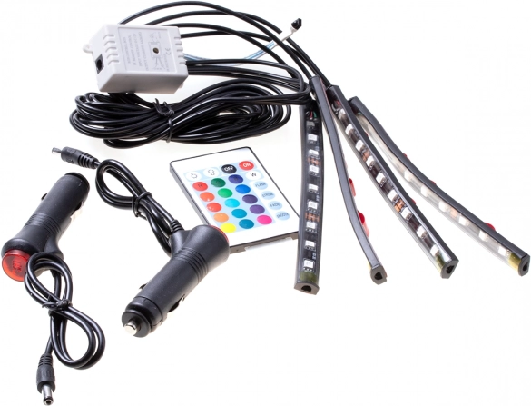 LED-strips gør det muligt at skabe en unik belysning i enhver bils interiør. Med LED-belysning kan du skabe et originalt look i din bil. Stripsene hjælper dig hurtigt og nemt med at foretage en simpel, men vigtig ændring i din bil. Strips kan monteres over indstigningslister, under sæder, under døre, i cockpittet, i bagagerummet osv. LED-stripsene fastgøres med dobbeltklæbende 3M-tape, så installationen er meget nem. Stripsene er vandtætte, så du behøver ikke bekymre dig om fugt. Ved at justere lysstyrken kan du selv bestemme, hvor stor en del af interiøret du vil oplyse. Strømforsyning direkte fra bilens cigarettænder – 12 V. Kan hurtigt og nemt slukkes takket være en speciel bagbelyst ON/OFF-knap på 12V-stikket til cigarettænderen.