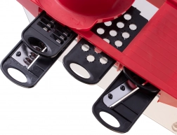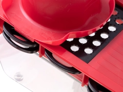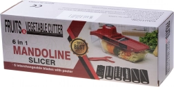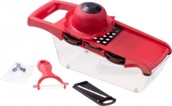 - Seks udskiftelige knive: 2 til Julienne (3 mm og 4 mm), 2 til skæring (1.0 mm og 1.5 mm), finrivningskniv og kniv til bølgeskæring.