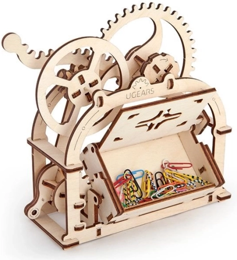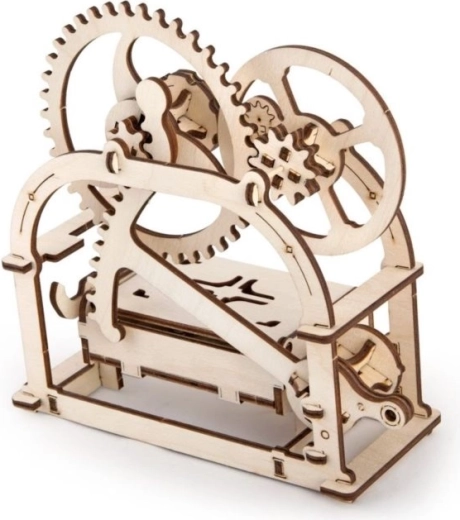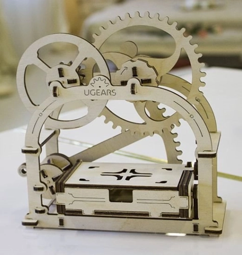 Den mekaniske æske fra UGEARS forener traditionelle materialer og smart bevægelse. Takket være et raffineret gearsystem er det nok at trykke på sidehåndtaget, hvorefter låget åbner med et behageligt klik. I pakken finder du to frontpanel‑varianter – med og uden udskæring – alt efter anvendelse.