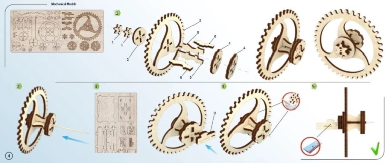 Præcist udskårne trædele, en klar billedvejledning og anbefalet voksning af aksler sikrer jævn rotation og problemfri drift.