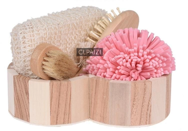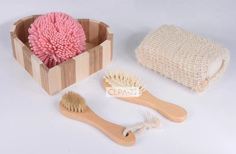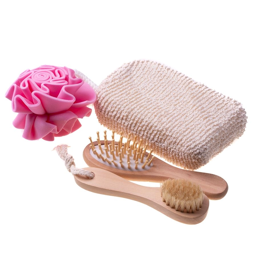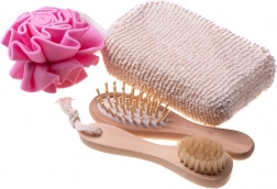 Dette 4-delte spa-sæt er placeret i en elegant trækurv formet som et hjerte (ca. 5,5 × 20 × 20 cm) og tilbyder et komplet ritual til hjemme-wellness. Kombinationen af badesvampe, en blid kropsbørste og en hårbørste sikrer grundig rensning, skånsom eksfoliering og behagelig massage.