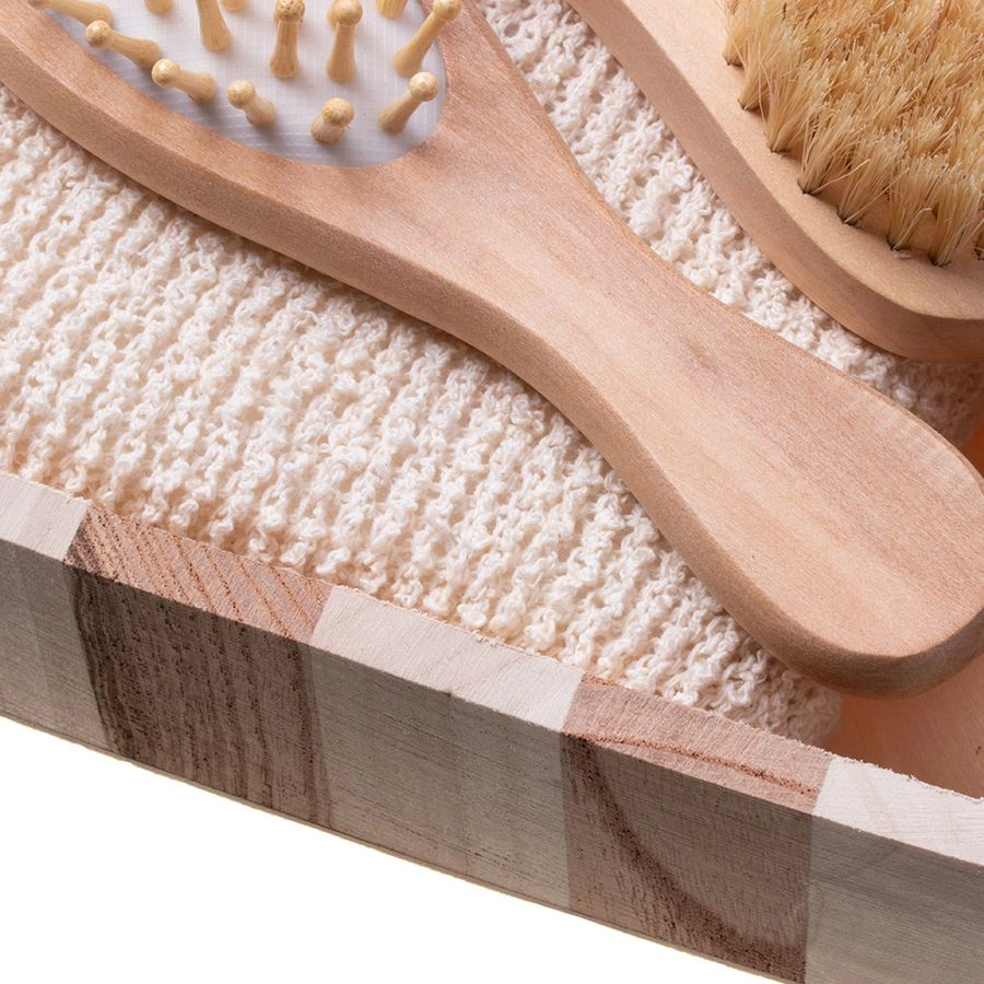 Regelmæssig brug hjælper med at fjerne døde hudceller, fremmer mikrocirkulation og efterlader huden silkeblød. Takket være de naturlige træhåndtag ligger redskaberne godt i hånden og ser flotte ud – ideelt som en stilfuld gave.