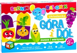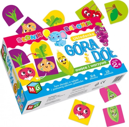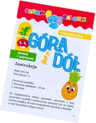 Spillet Op og ned: frugt og grøntsager er et ideelt første puslespil for børn og deres forældre. Opgaven er at finde de rigtige par, så den øverste del af billedet passer til den nederste. Farvede baggrunde gør det nemmere at orientere sig og hjælper med at lægge hele motivet hurtigere.