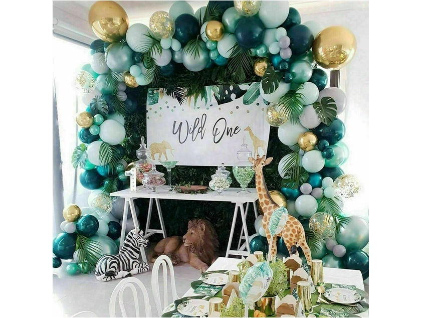 Monteringen er enkel: pust ballonerne op med luft eller helium og fastgør dem i hulbåndet. Placer de mindre balloner langs kanten for en fyldig og lagdelt effekt. Tropiske og palmeblade giver et eksotisk præg og passer perfekt til den grøn-guld farvepalette.