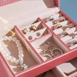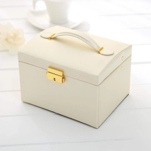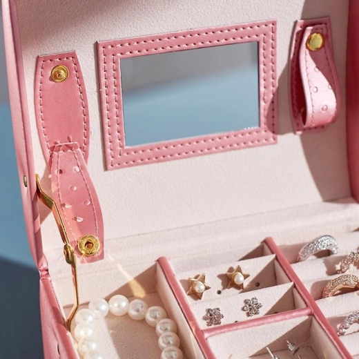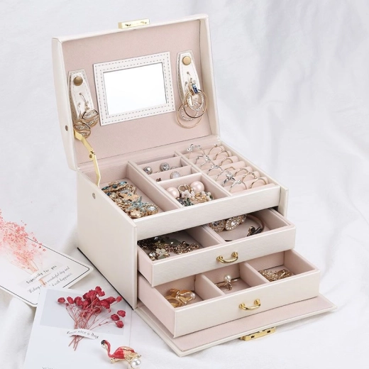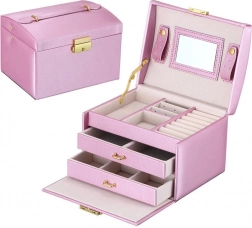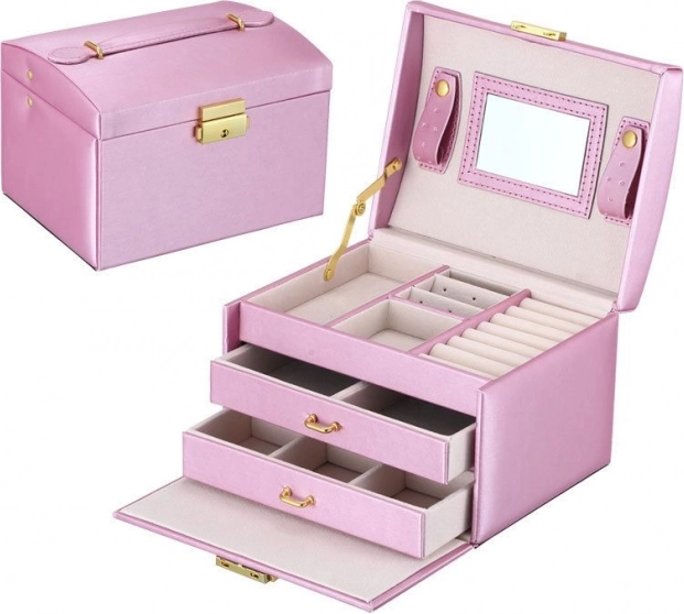 Blandt enhver kvindes personlige ejendele spiller smykker en vigtig rolle. Et smykkeskrin i flere niveauer er uundværligt og pålideligt til opbevaring af dine værdigenstande. Adskilte rum og skuffer giver perfekt plads til øreringe, armbånd, ure, kæder, briller og andre værdigenstande. Smykkeskrinet fjerner problemet med sammenfiltrede kæder, slid og ridser. Du kan opbevare guld-, sølv- og modesmykker hver for sig. Den bløde polstring beskytter dine kostbare smykker mod ridser. Smykkeskrinet har et stort aftageligt spejl, som er velegnet til at prøve smykker og til makeup.
