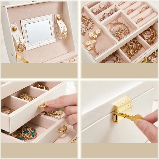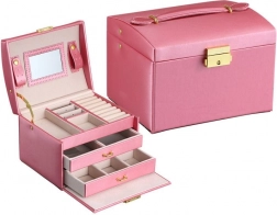 Blandt en kvindes personlige ejendele spiller smykker en vigtig rolle. Et flerlags smykkeskrin er en uundværlig og pålidelig løsning til opbevaring af dine værdigenstande. Adskilte rum og skuffer giver perfekt plads til øreringe, armbånd, ure, kæder, briller og andre værdigenstande. Smykkeskrinet eliminerer problemet med sammenfiltrede kæder, slid og ridser. Den bløde polstring beskytter dine kostbare smykker mod ridser. Smykkeskrinet har et stort aftageligt spejl, der er ideelt til at prøve smykker og lægge makeup.