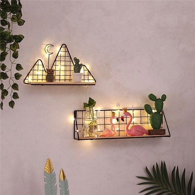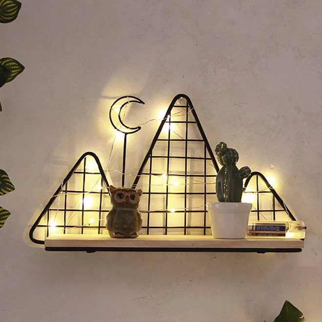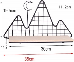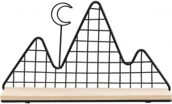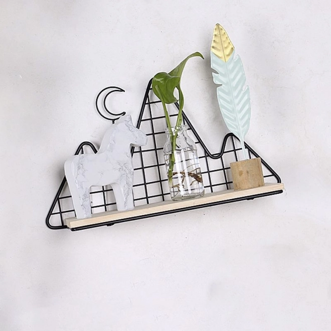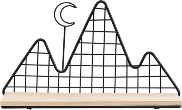 Denne dekorative hylde i elegant sort forener funktionalitet og design. Den lette trådkonstruktion med bjergmotiv virker luftig, mens den solide træhylde sikkert bærer små dekorationer, lys, planter, rammer eller yndlingsbøger.