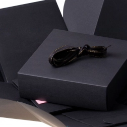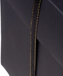 Æske med sort bånd og gyldne stikninger, velegnet til en elegant gavepræsentation.