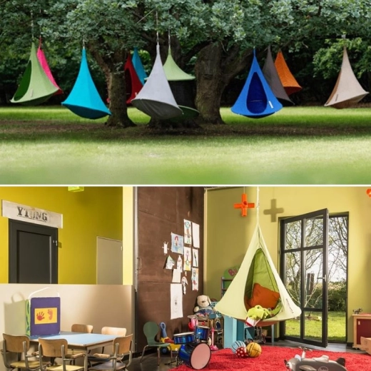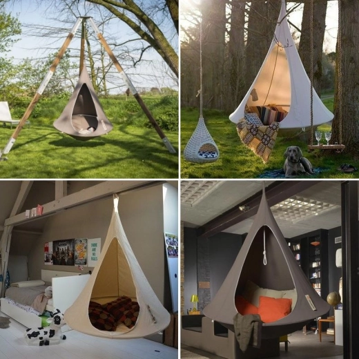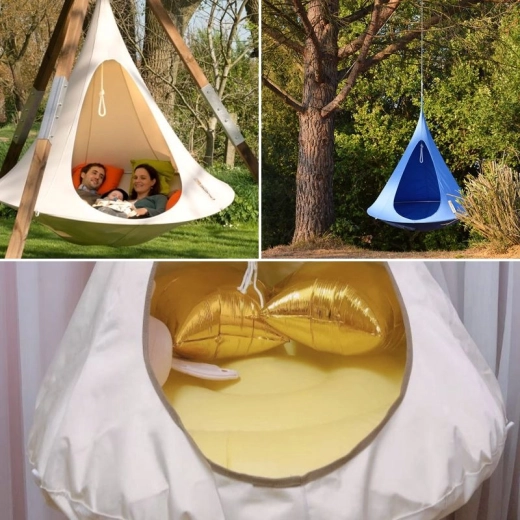 Det hængende telt er et uundværligt tilbehør til både haven og børneværelset. Det lader dig slappe af i de varme sommerdage i haven, og om vinteren er det ideelt til de mindste derhjemme. Den hængende kokon er lavet af vandafvisende materiale, modstandsdygtigt over for skimmel og UV 50-stråling. Det hængende telt ser meget imponerende ud og minder i formen om et fuglerede eller en UFO.