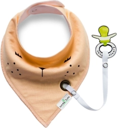 Sødt børnetørklæde med et blidt vedhæng til sut. Halsaccessoriet fungerer perfekt som savlesmæk til småbørn i tandfrembrud. Det medfølgende vedhæng kan udskiftes med dit eget. Den komfortable spænde-/trykknaplukning trykker ikke på barnet og giver mulighed for at justere omkredsen.