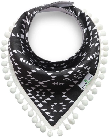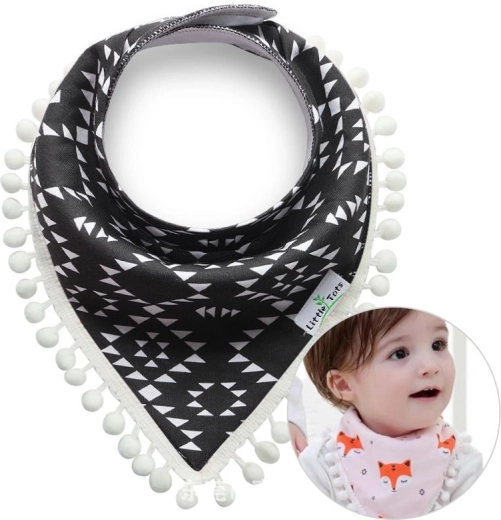 Det søde børnetørklæde med pomponer er et glimrende halstilbehør, som også fungerer godt som savlesmæk, når tænderne er på vej. Den behagelige lukning med trykknapper strammer ikke om barnets hals, og der er desuden en justerbar kant.