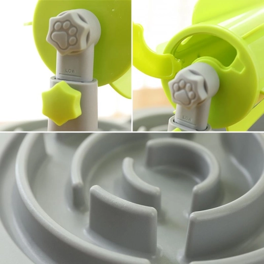 Den langsomt-fodrende skål hjælper med at forebygge fordøjelsesproblemer forårsaget af for hurtig indtagelse af foder. Den er formet til at forlænge den tid, vores kæledyr bruger på at spise, så oppustethed og andre fordøjelsesproblemer undgås. Skålen har et labyrintmønster af riller, som giver dit kæledyr en udfordring. Størrelsen på de placerede godbidder ændrer sværhedsgraden. Dispenseren til tørfoder stimulerer appetitten og giver en sjov spiseoplevelse.