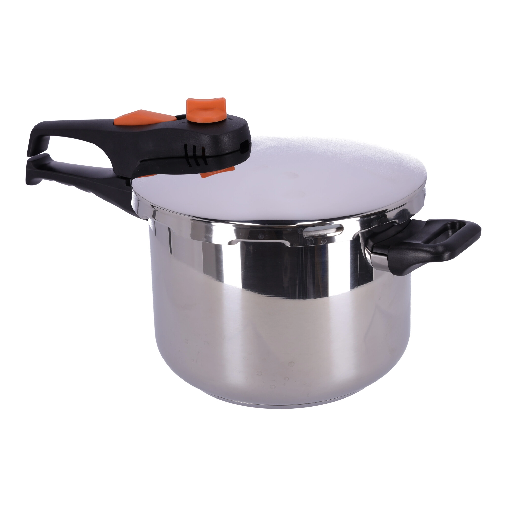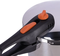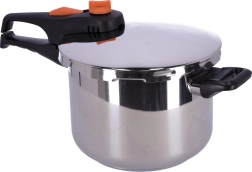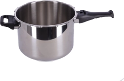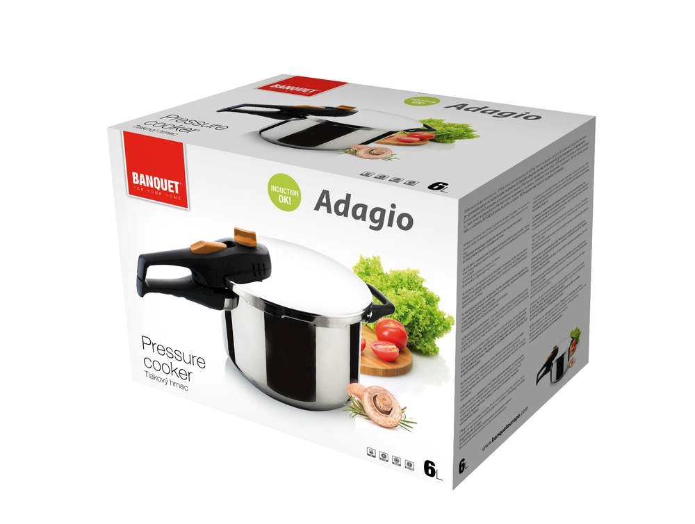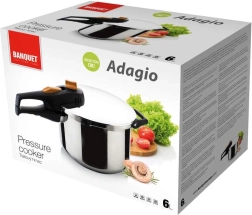 Trykkogeren BANQUET ADAGIO med volumen på 6 liter fremskynder tilberedningen af yndlingsretter, bevarer flere vitaminer og mineraler og sparer samtidig tid og energi. Robustt rustfrit stål 18/8, 1 mm tykke vægge og 5 mm kraftig sandwichbund sørger for stabil opvarmning og lang levetid. Sikker bajonetlukning, arbejdsåbning og sikring mod åbning under tryk garanterer rolig og bekvem brug.