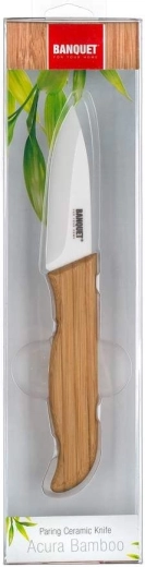 Praktisk keramisk kniv ACURA BAMBOO 18 cm, keramisk klinge (zirkoniumoxid) længde 7,5 cm, klingetykkelse 1,6 mm, bambushåndtag. Klingen på den keramiske kniv er lavet af et keramisk materiale kaldet zirkoniumoxid. Denne sammensætning er kendetegnet ved høj hårdhed og styrke. Det ergonomiske håndtag er lavet af TPR med en skridsikker overflade. Kniven er meget modstandsdygtig over for pletter og er let at rengøre. Klingen lader ingen syrer fra fødevarer trænge igennem. Vitaminerne går ikke tabt fra maden takket være den keramiske klinge. Kød, grøntsager og frugt klæber ikke til kniven. Kniven har meget lav vægt og et afbalanceret tyngdepunkt, hvilket gør den let at håndtere under arbejdet. Keramiske knive er hårdere end metal, så de behøver ikke daglig slibning på brynesten som stålknive. Som kompromis for deres høje hårdhed er de mere sprøde, derfor anbefales det ikke at skære f.eks. knogler, vride kniven under skæring eller lade den falde på gulvet.