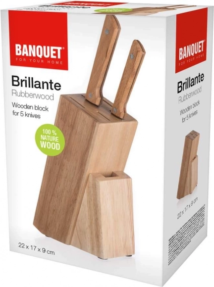 Praktisk træblok til 5 knive og en saks BRILLANTE i målene 22 × 17 × 9 cm holder dine køkkenknive altid lige ved hånden. Den er fremstillet af holdbart tropisk gummitræ og udstyret med skridsikre fødder for stabilitet på bordpladen. Moderne design og pladsbesparende gør den til et elegant tilbehør i ethvert køkken.