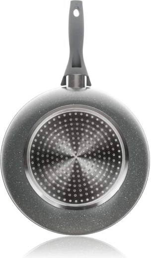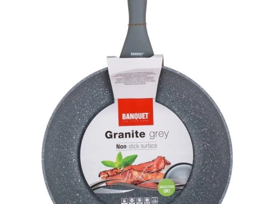 Smedet aluminiums-wokpande GRANITE GREY 28 x 7,8 cm med nonstick-belægning, mønster i grå granit, godstykkelse 3 mm, blødt greb. Nonstick-overfladen er meget hård og modstandsdygtig over for ridser. Høj varmeledningsevne for hurtig og energibesparende madlavning – holder varmen længe. Panden er modstandsdygtig over for stød og deformation. Velegnet til alle typer kogeplader, inklusive induktion.