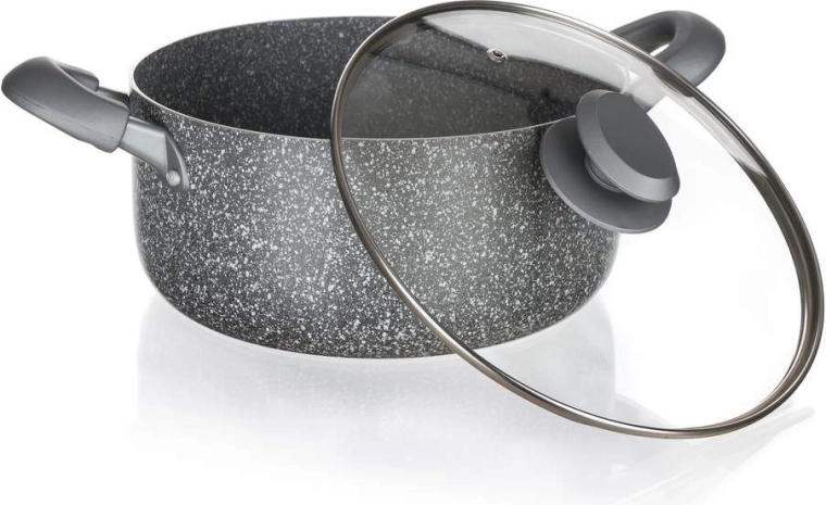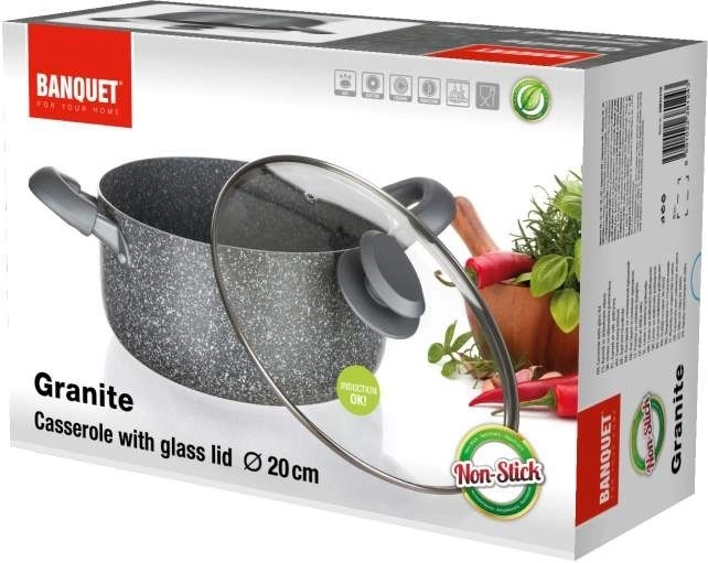 Gryden BANQUET GRANITE kombinerer moderne design med høj funktionalitet. Korpus af presset aluminium sikrer hurtig og jævn varmefordeling, mens den to-lags nonstick-belægning med graniteffekt minimerer fastbrænding og gør vedligeholdelsen nem. Glaslåget gør det muligt at kontrollere madlavningen uden unødigt varmetab.