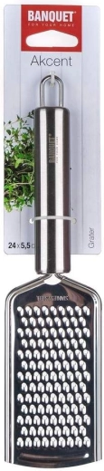 Rivejern AKCENT 24 x 5,5 cm i rustfrit stål til professionel brug og til hjemmet. Rivejernet er udstyret med en praktisk ophængsring, ligger godt i hånden og kan vaskes i opvaskemaskinen. AKCENT-serien opfylder de krævende behov hos professionelle og er også beregnet til hjemlig brug. Det enkle og funktionelle design sikrer tidløshed samt lang holdbarhed og høj kvalitet for alle produkter.