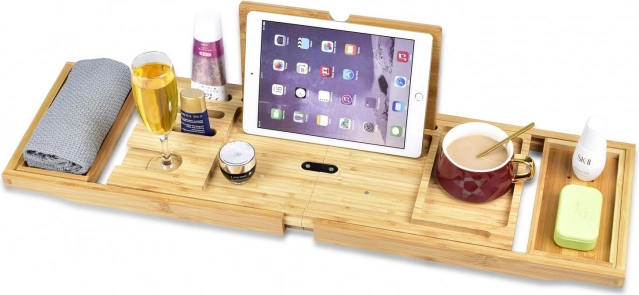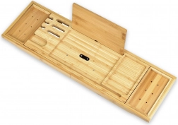 Den perfekte løsning til at skabe en spa-atmosfære i dit badeværelse. Bambus badekar hylden er designet til at passe til forskellige størrelser og former på badekar. Den er klar til øjeblikkelig brug uden montering. Der medfølger også en plads til en tablet og en særlig holder til vinglas, hvilket gør det muligt at slappe helt af under et bad.
