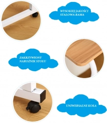 Bordet er placeret på en specialdesignet ramme, der gør det nemt at bruge selv i sengen. Fire hjul på basen giver mulighed for hurtig og sikker flytning af hele enheden. Hvis du vil låse hjulene på bordet, skal du blot trykke låsen ned. Fodstykkerne kan tages af meget hurtigt. Bordet er ideelt til brug i stuen, soveværelset eller køkkenet. En meget stor fordel ved vores bord er den justerbare højde, så du kan tilpasse det efter dine ønsker. Bordet kan højdejusteres i intervallet 70-90 cm. En anden fordel er det universelle og meget stilfulde farvedesign.