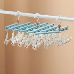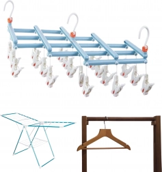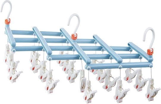Praktisk sammenklappelig tørrehænger med 19 klemmer, ideel til at tørre strømper, undertøj og små beklædningsdele. Let og robust plastkonstruktion, drejelig krog for nem ophængning og pladsbesparende foldning gør denne hænger til en pålidelig hjælper derhjemme, på altanen og på farten.