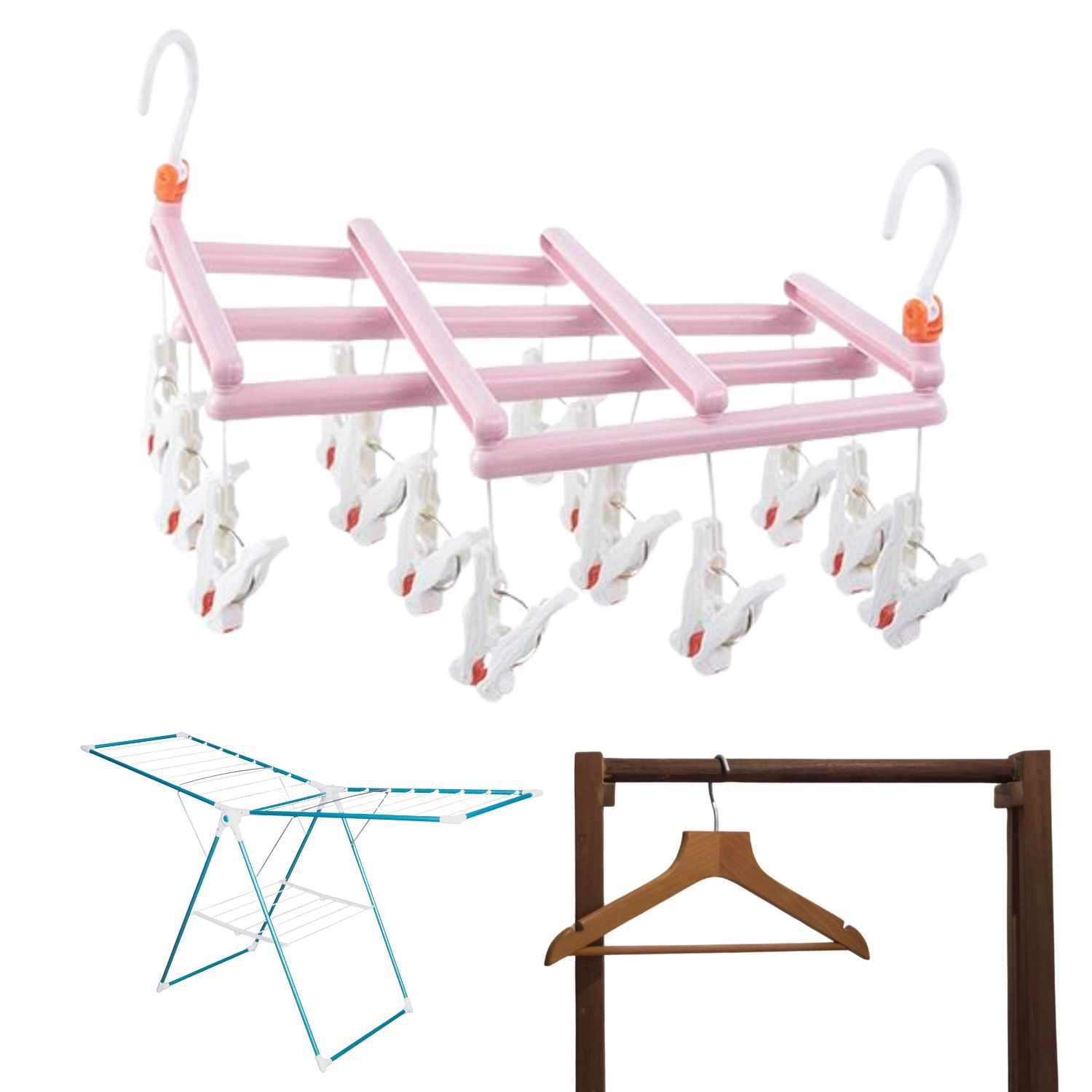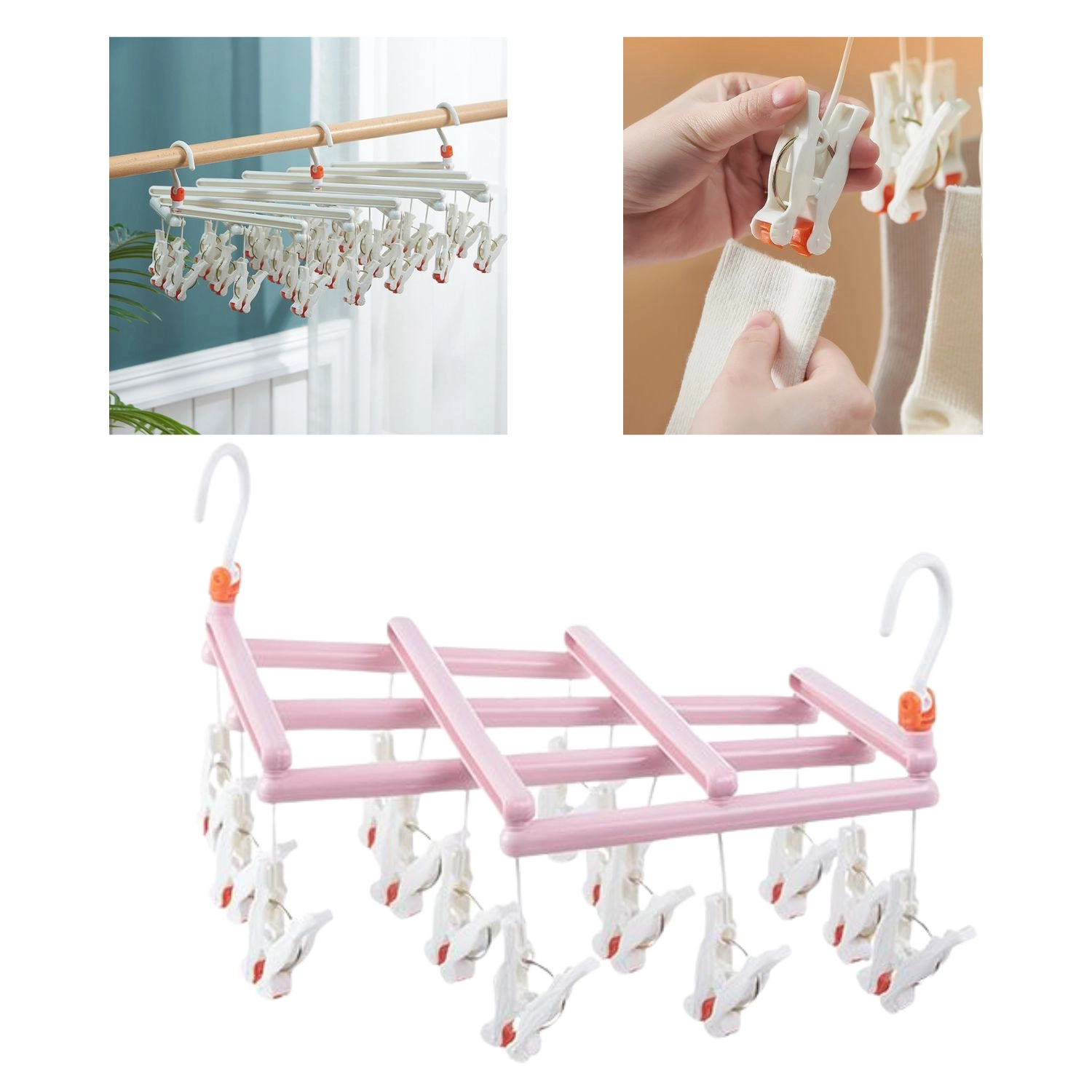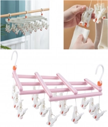 Hold styr på tøjet under tørring og udnyt hver centimeter plads. Dette rosa tørrestativ med 14 solide klemmer giver hurtig og overskuelig ophængning af mindre tekstiler. Den drejelige krog gør det let at hænge på stang, snor, altan eller tørrestativ, og det sammenklappelige design gør opbevaring og transport let.