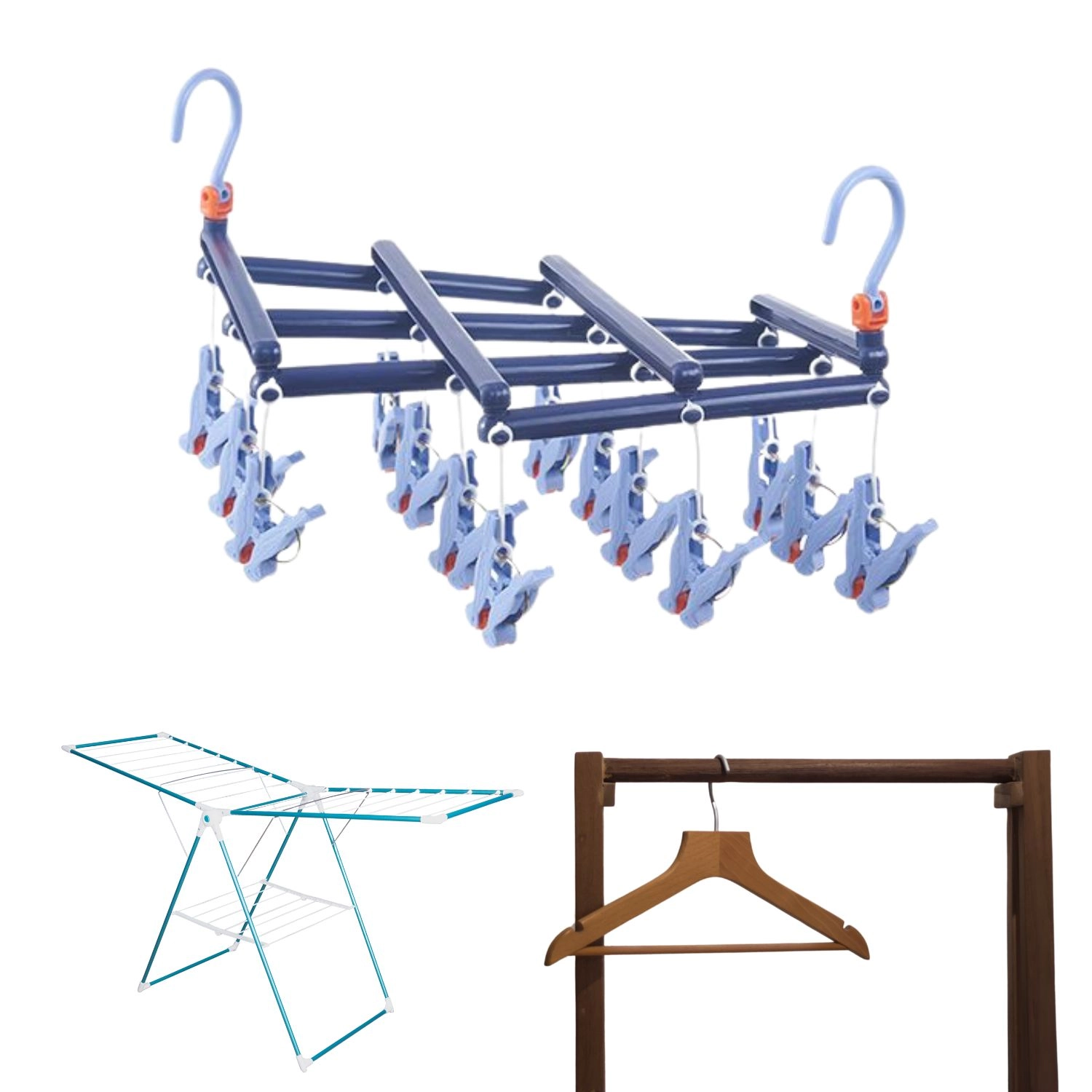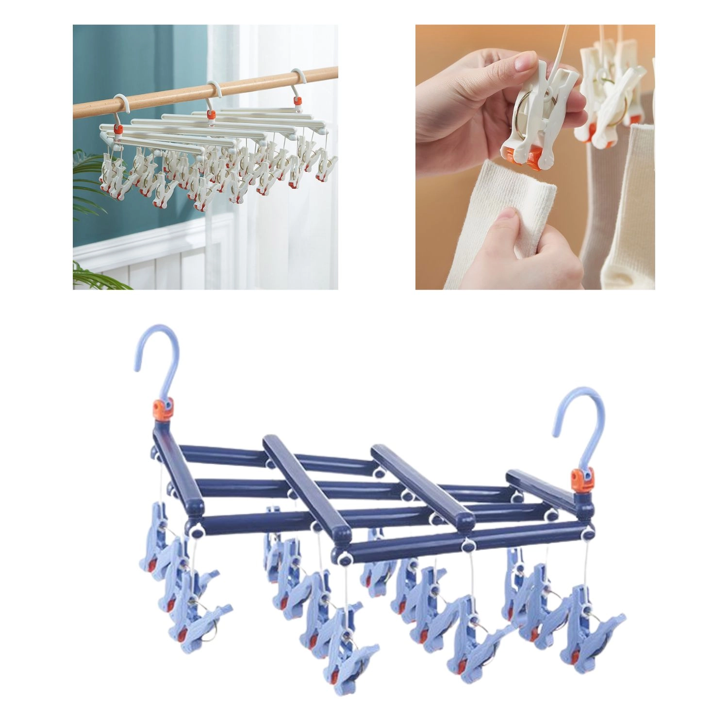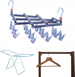 Opdag en pålidelig løsning til hverdagstørring af småt tøj. Det sammenklappelige tørrestativ med 14 robuste clips er fremstillet af kvalitetsplast, der er modstandsdygtig over for fugt, så du trygt kan bruge det både inde og ude. Den drejelige krog med lås giver stabil ophængning hvor som helst – på altangelænder, tørrestativ, garderobestang eller en campingsnor.