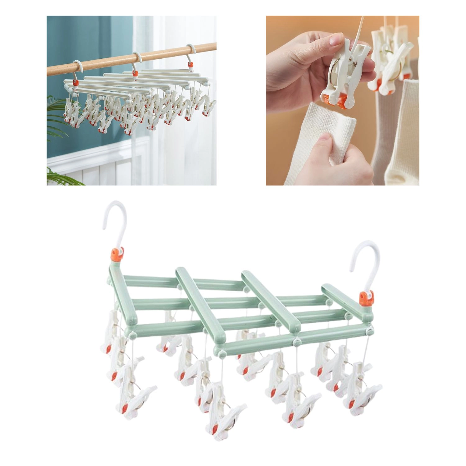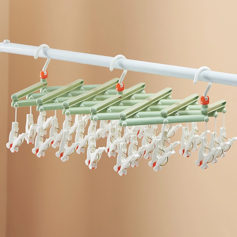 Nyd nem tørring af småt tøj både inde og ude. Den sammenklappelige tørreholder med 14 klemmer giver en kompakt løsning til sokker, undertøj og børnetøj. Takket være den roterende krog med lås hænger du den nemt på stang, snor eller tørrestativ, og tøjet bliver hvor du ønsker det.