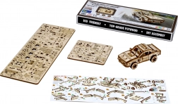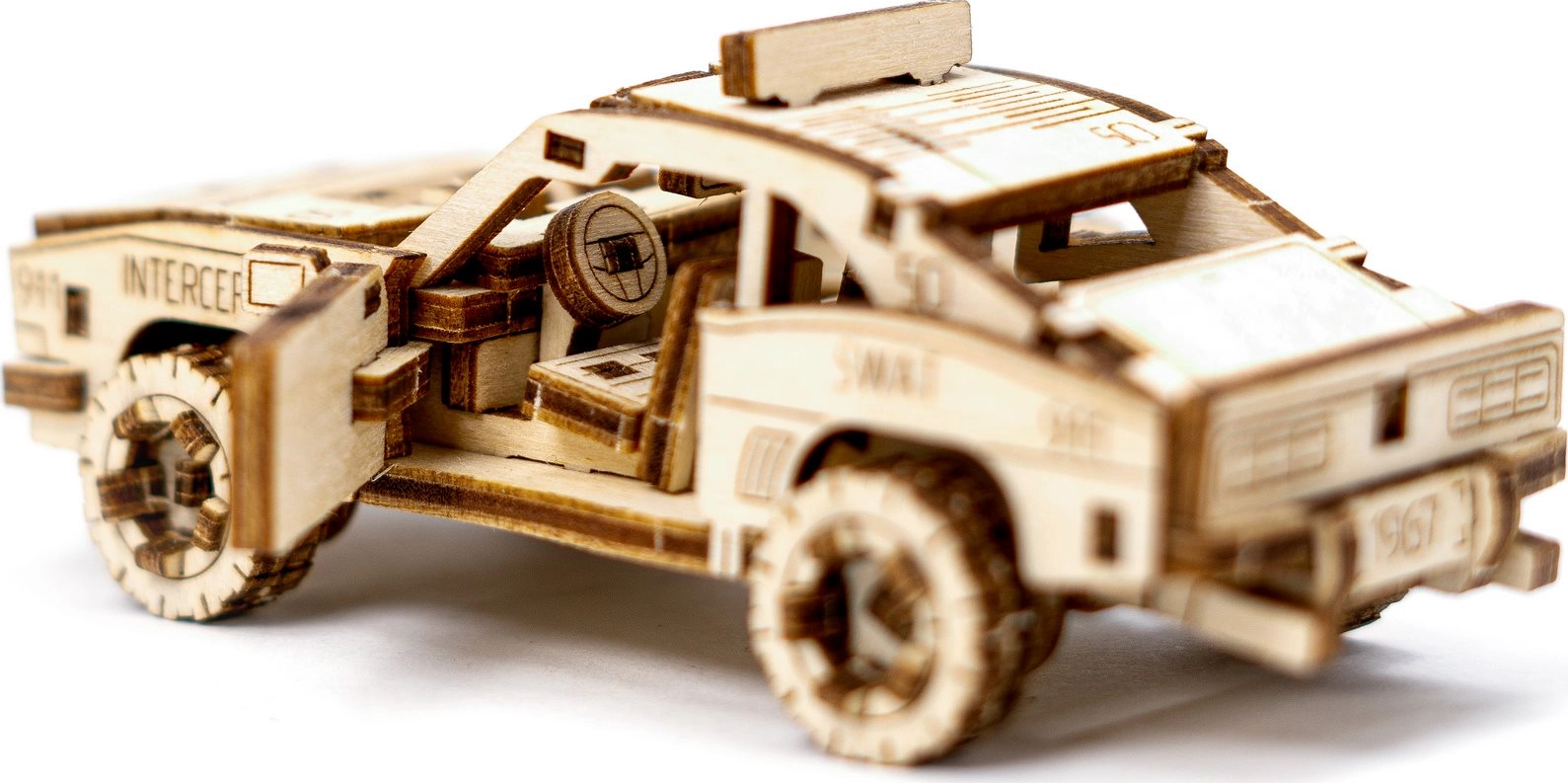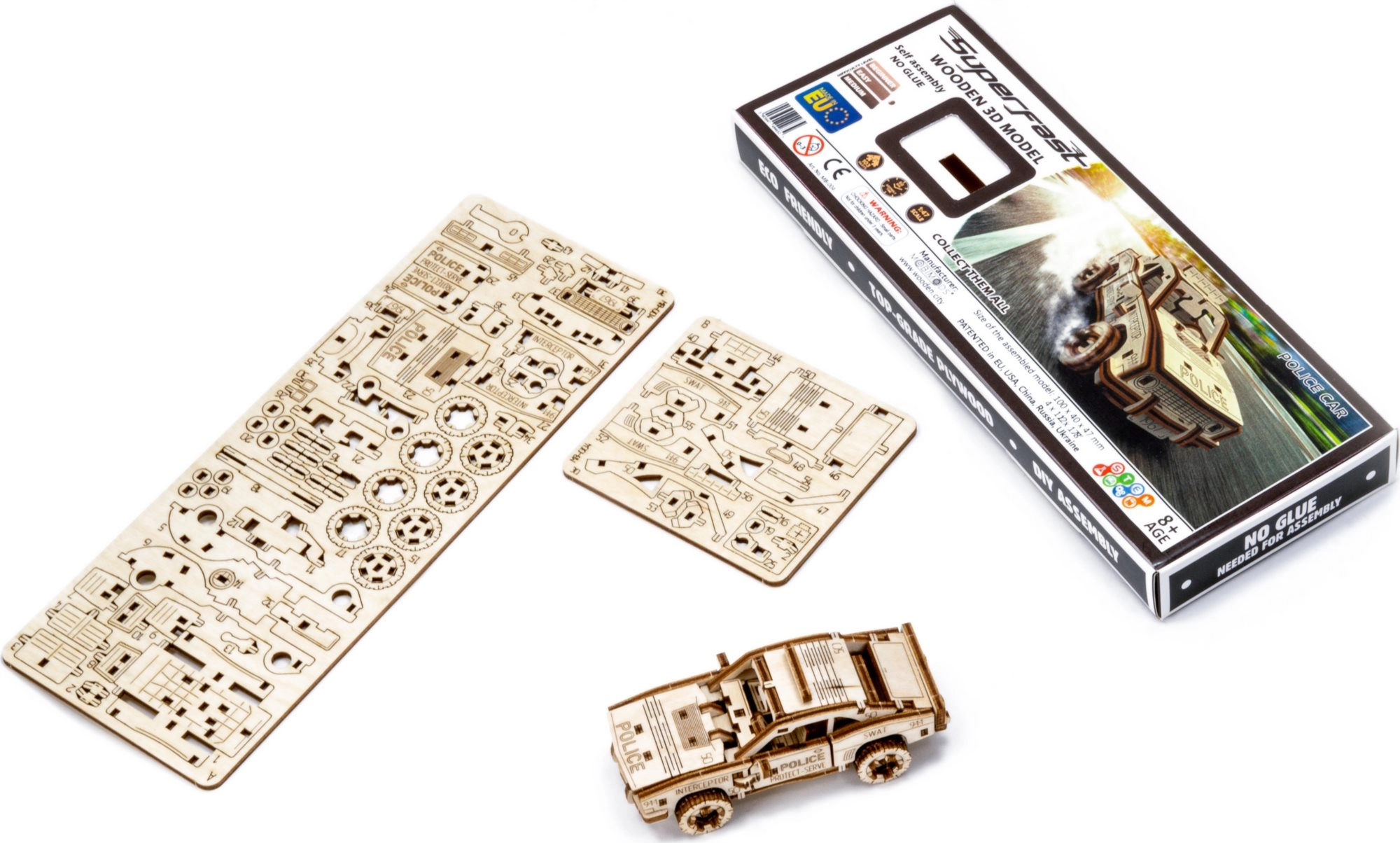 Samlingen er uden lim, og delene passer præcist sammen. Resultatet er en robust miniature af en politibil, som tager sig godt ud på reolen eller skrivebordet. Mærket WOODEN CITY lægger desuden vægt på økologi – produktet er pakket uden plast.