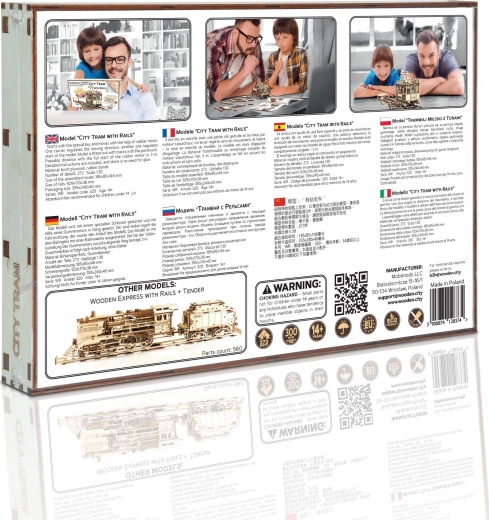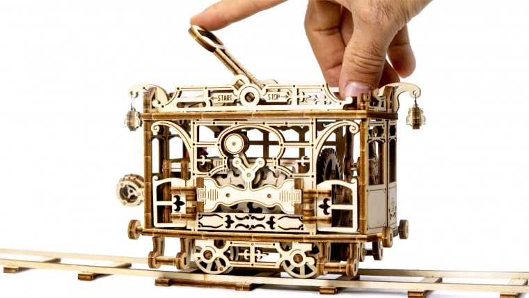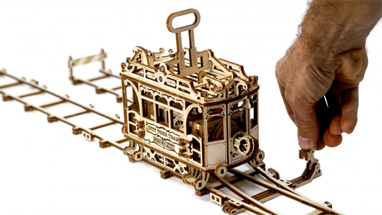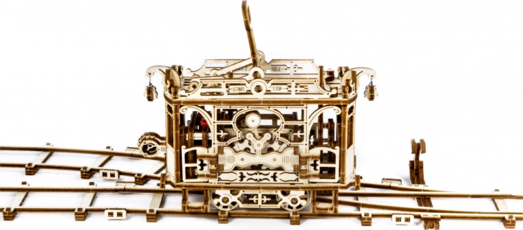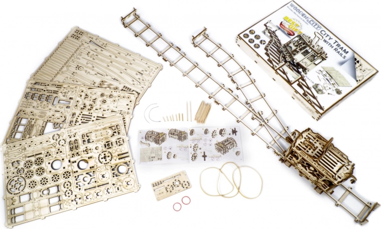 Byg din egen bysporvogn af naturlig krydsfiner og nyd dens funktionelle mekanik på de medfølgende skinner. Modellen drives af elastikmotor, kan køre frem og tilbage, har regulering af retning og start og kører op til 3 meter pr. optræk. Samling uden lim med detaljeret udførelse er superb underholdning for både børn og voksne.