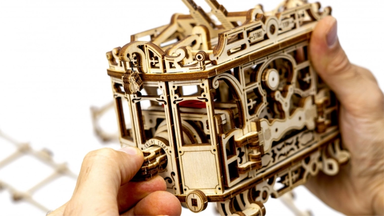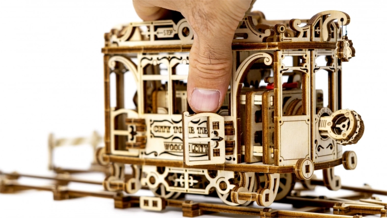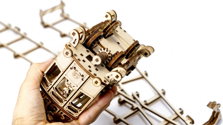 Denne præcist udskårne sporvogn i birkekrydsfiner giver en autentisk mekanik-oplevelse – fra tandhjul og gear til elastikmotoren. Efter samling kører sporvognen på de medfølgende skinner og glæder med jævn gang og elegant design.
