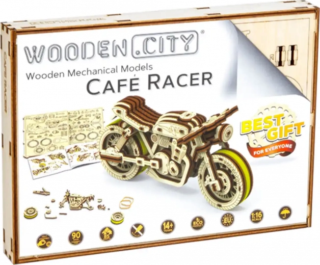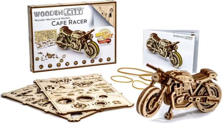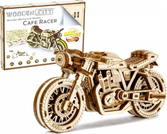 Café Racer-motorcyklen fra WOODEN CITY er en detaljeret træmodel i skala 1:16, der liver op på dit bord eller i din montre. Takket være gummimotoren og tilbagespændingsmekanismen bevæger modellen sig frem og tilbage, klarer en rækkevidde på cirka 1 meter og giver indblik i den ægte mekanik med tandhjul.