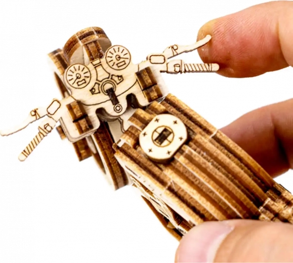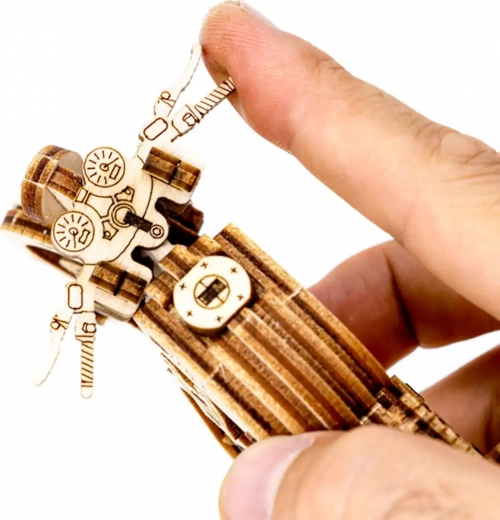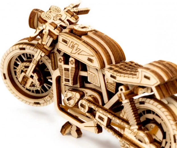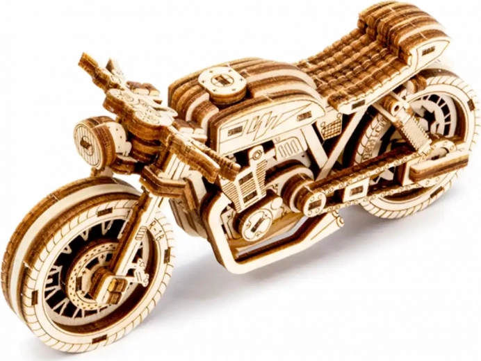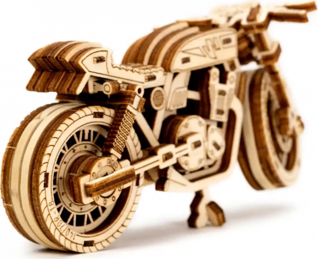 Byg en stilfuld Café Racer-motorcykel af naturlig krydsfiner og nyd dens funktionelle mekanik. Modellen kører takket være tilbagespoling og en gummimotor op til 1 meter, har gummibelagte hjul, svinghjulsmekanisme og realistiske betjeningselementer. Samlingen foregår uden lim og værktøj, og emballagen fungerer som en stander.