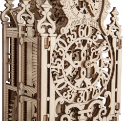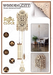Træ 3D-puslespil WOODEN CITY Kongelige ur er et fremragende mesterværk med avancerede detaljer og elegante linjer. Den perfekte gave til elskere af skønhed og overraskelser. Modellen er inspireret af rokoko-stilen og inkluderer detaljerede, udskårne sammenflettede mønstre. Det kongelige ur er designet til at fungere som et ægte tidsmåler med justerbar pendulperiode, som afhænger af mængden af indsatte mønter.