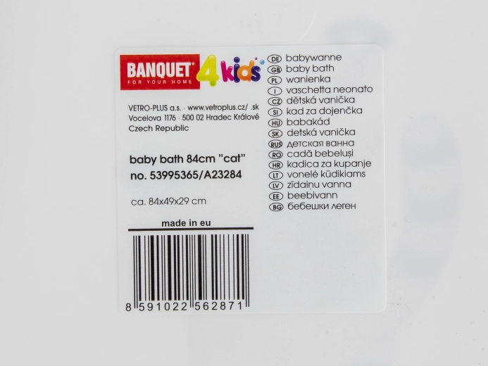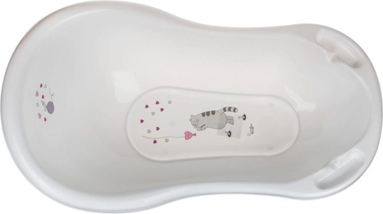 Praktisk babybadekar på 84 cm i elegant hvid med et sødt kattemotiv. Tilbyder ergonomisk form for behagelig og sikker badning fra fødslen, nem håndtering og let rengøring. Integrerede aflægningsfordybninger holder svamp, sæbe eller legetøj lige ved hånden. Bæreevne op til 25 kg.