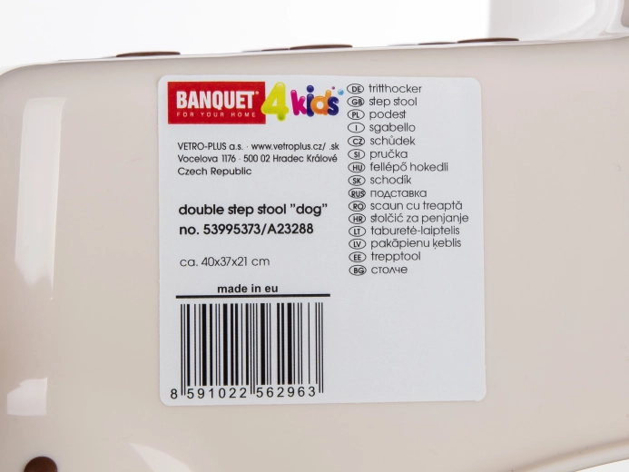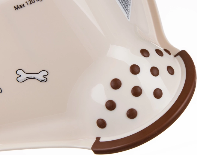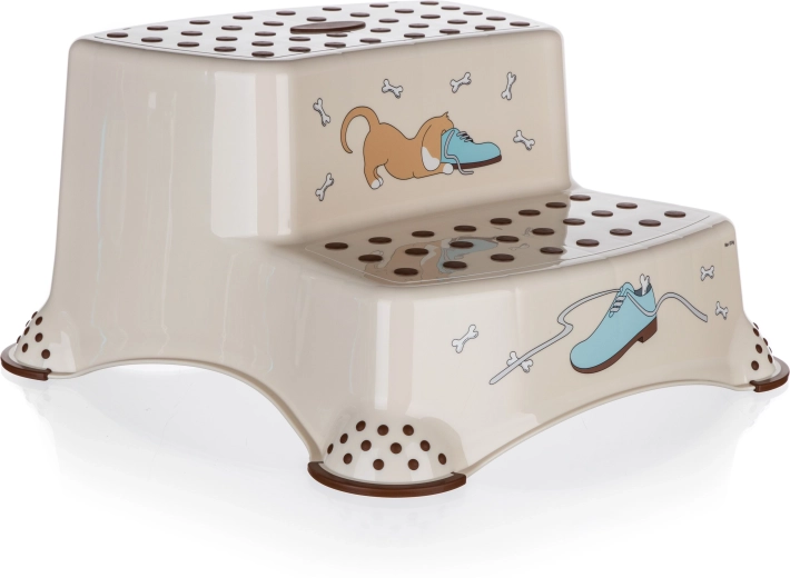 Den beige totrins skammel med det sjove DOG-motiv er ideel til børn på badeværelset, i køkkenet eller børneværelset. Skridsikre knopper på trinene og skridsikre fødder i bunden giver sikkert fodfæste på både våde og tørre overflader. Med de kompakte mål 40,5 × 37 × 21 cm er den nem at bære og opbevare.
