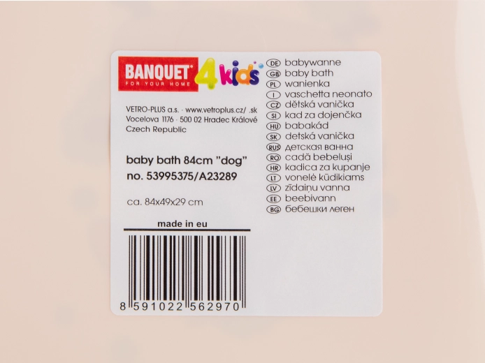 BANQUET-børnebadekarret med Dog-dekor er designet til komfortabel og sikker badning af spædbørn og småbørn. Den ergonomiske udformning støtter barnets krop, mens glatte, afrundede kanter øger sikkerheden og komforten. Takket være den lette plastkonstruktion er karret nemt at bære og holde rent.