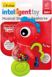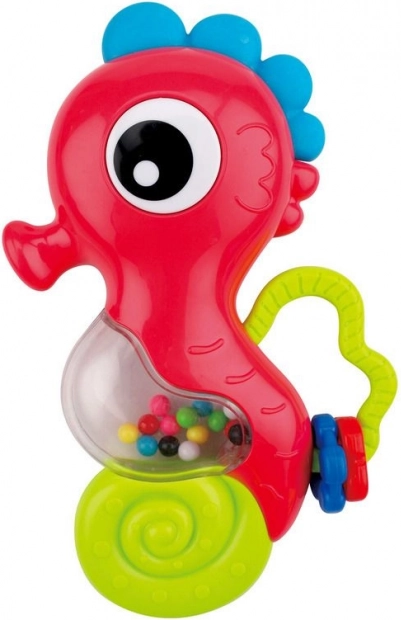 En musikalsk rangle formet som en søhest med blød manke giver din baby masser af underholdning og er ideel under tandskæring. Søhestens mave indeholder farvede perler, så når du ryster legetøjet, hører du 6 toner!